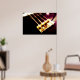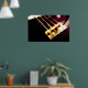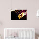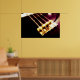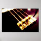 La photographie abstraite originale sur cette affiche d'art se concentre sur la base d'une guitare basse électrique, la partie où les cordes commencent et montent jusqu'au cou. La coloration photo closeup est faite dans des brins chauds et riches avec une lumière dorée sur la plaque métallique, cordes, vis et ressorts.