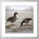 Rather than emphasizing dramatic movement or strict scientific detail, the artwork focuses on stillness, balance, and the subtle relationship between the birds and their surroundings. One goose stands alert while the other feeds calmly, creating a gentle sense of presence and shared time within the quiet winter landscape.