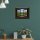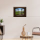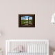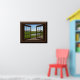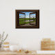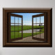 Cette affiche présente un magnifique parcours de golf par une fenêtre ouverte.