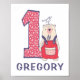 Beau premier anniversaire avec affiche du nom. Modifiez le nom. Célébrez le premier anniversaire de votre petit avec cette affiche personnalisée. Petit ours mignon en dungarees illustration, avec le numéro un. Fait un grand cadeau.