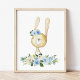 Affiche Bébé lapin, Animaux en bois, Boho, Fleurs bleues
