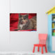 Un beau animal de compagnie se détend sur un tapis rouge dressé contre un arrière - plan rouge.