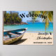 Un poster de bienvenue mariage avec une scène de plage tropicale idyllique. Eau cristalline bleu turquoise et plage de sable brun doux. Des feuilles de palmiers accrochés au-dessus. Un vieux bateau à rames en bois est installé sur la plage. Un paysage serein et paisible.