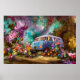Affiche Belle vieille fourgonnette Combi turquoise avec fl