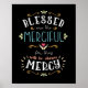 Belle affiche Béatitudes avec lettrage à la main, ornements design et accents entourant la typographie sur arrière - plan foncé comprend les mots, "Heureux sont les Miséricordieux, car ils se montrent miséricordieux." Cette Écriture bien-aimée est un extrait du sermon de Jésus sur le Mont dans l'Évangile de Matthieu, chapitre 5.