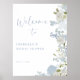 Célébrez votre jour spécial avec notre affiche de bienvenue pour une fête de mariage enchanteuse, dotée d'une bordure florale aquarelle bleu poussiéreux douce et romantique. Ornée de magnifiques hortensias bleus, de delphiniums, de roses blanches et de verdure, cette affiche de bienvenue dégage élégance et charme. La police bleu poussiéreux minimaliste intemporelle ajoute une touche de sophistication, parfaite pour un thème de fête de mariage "Quelque chose de bleu avant de me marier". Définissez le ton de votre fête de mariage de rêve avec cette superbe affiche de bienvenue qui enchantera vos invités et créera des souvenirs durables de votre histoire d'amour.