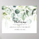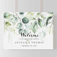 Cette pancarte de bienvenue pour une fête de fiançailles à l'aquarelle eucalyptus est parfaite pour une célébration de fiançailles rustique. Ce design artistique présente un feuillage vert eucalyptus dessiné à la main et peint à l'aquarelle, inspirant une beauté naturelle.