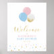 Accueillez vos invités avec ce panneau de bienvenue à la fête de bébé moderne et mignon. Cette conception d'affiche présente une typographie élégante et des ballons avec des confettis en rose, bleu clair et or. Décoration de fête parfaite pour une fête de révélation du sexe de bébé. Les invitations et les fournitures de fête assorties sont disponibles dans ma boutique BaraBomDesign.
