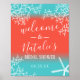 Panneau de bienvenue pour la réception de mariage sur le thème de la barrière de corail et de l'étoile de mer de mariage sur la plage.