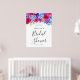 Des fleurs d'hydrangea bleu vif, des roses violettes profondes et des fleurs tropicales rose magenta créent un arrangement floral vibrant. La réception de mariage est écrite en calligraphie moderne. Ce panneau de bienvenue fait partie de la collection rose violet bleu gras.