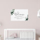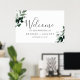 Cette affiche d'accueil mariage émeraude est parfaite pour un mariage boho. Le design élégant et rustique présente des feuilles d'aquarelle vert foncé moody et des eucalyptus aux tons bohèmes modernes. Customisez l'affiche avec le nom de la mariée et du marié, et la date du mariage.
