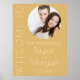 Élégante affiche de bienvenue de mariage moderne avec des nuances monochromes de champagne et un encart photo.