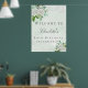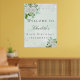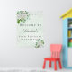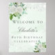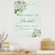 Une affiche de bienvenue moderne, élégante et glamour pour les 80 ans (ou tout âge) d'une femme. Un fond vert aquarellé avec de la poussière de paillettes argentées et des fleurs blanches et de la verdure. Le nom est écrit avec un style de lettrage manuscrit élégant. Personnalisez et ajoutez un nom et un âge.