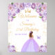 Cette pancarte de bienvenue pour une fête d'anniversaire élégante et glamour présente une belle princesse avec des cheveux bruns dans une robe de bal violet clair. Le texte combine une écriture manuscrite et des polices modernes sans serif pour un look classe et sophistiqué. Les arrangements floraux, le papillon et les confettis dorés créent le mélange parfait de rustique et de chic.