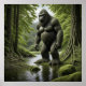 L'art de l'Ai représente Sasquatch debout dans une rivière qui traverse les bois.
