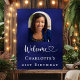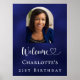 A welcome poster for a 21st (or any age) birthday party. Personalize and add a photo, a name and age. A navy blue, uneven colored background, and an arch shaped photo frame.