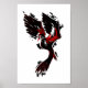 a decorative artwork of a black and red colored mythical phoenix spreading its wings.