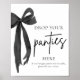 🖤 👙 Ajoutez une touche élégante à votre douche nuptiale avec ce Black Bow moderne "Drop Your Panties Here" Jeu Sign! Conçu avec un arc noir épuré et un style minimaliste, ce panneau invitation les invités à offrir secrètement à la mariée une paire de culottes pour un jeu d'devinette amusant. Un complément ludique et élégant à votre célébration, parfait pour les douches nuptiales modernes ou à thème coquette ! 🎀 ✨