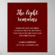 Cet élégant panneau mémorial blanc sur rouge, avec sa touchante citation "La lumière demeure" est une belle façon de se souvenir et d'honorer l'être cher lors de la célébration de la réunion de vie. Personnalisez avec votre texte en bas.
