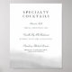 Conçu pour correspondre à notre collection Mist mariage, cet élégant panneau est parfait pour placer au bar pour partager vos créations de cocktails de spécialité avec les invités. Personnalisez l'en-tête et les six champs de texte sur un simple lavage d'aquarelle gris clair.