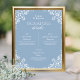 Personnalisez votre chic mariage bleu et blanc poussiéreux jusqu'à la carte des boissons signature pour vos invités. Ajoutez une boisson préférée pour lui, elle et eux, ou changez-la en nom de chiens, chats ou animaux de compagnie. Ajoutez les ingrédients à votre menu de 3 bars à boissons. Idéal pour un élégant et ancien argent avec un thème mariage de charme vintage pour le couple chic, classique et intemporel. Conçu par Simple Desert Designs pour Zazzle. Faites-nous parvenir un message pour que les couleurs personnalisées correspondent à votre thème mariage exact.
