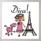 T-shirts, costumes, tasses, sacs, cartes, autocollants, porte - clés, coussins, horloges murales, et bien plus encore avec un design de diva mignonne avec une fille blonde dans une robe casquette et rose avec son caniche rose près de la Tour Eiffel !