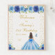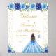Ce panneau de bienvenue élégant et glamour pour la fête d'anniversaire présente une belle princesse aux cheveux brunes et à la peau claire dans une robe bleue. Le texte combine écriture manuscrite et polices sans serif modernes pour un look élégant et sophistiqué. Les compositions florales, les papillons et les confettis d'or créent un mélange parfait de rustique et de chic. Graphiques par www.etsy.com/uk/shop/SunflowerDayLove