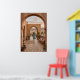 Boho desert scene with woman in flowing blue dress walking toward sunset arches, framed by terracotta walls, cacti, agave, and monstera plants. Patterned rug, woven baskets, and tiled floor add cozy Southwest charm. Perfect for bedroom, living room, or boho entryway decor—high-resolution digital illustration.