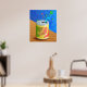 Illustration d'une boisson gazeuse en conserve avec une paille et des bulles qui en sortent reposant sur une table en bois. Image disponible sur divers cadeaux et produits. Posters. Tirages.