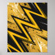 Un arrière - plan abstrait frappant dominé par des formes en zigzag jaunes audacieuses coupant sur fond noir. Le design est imprégné de motifs géométriques tranchants, de triangles fragmentés et de rayures blanches ressemblant à des éclats énergétiques. Le contraste entre le jaune doré et le noir profond crée un impact visuel puissant et dynamique, tandis que les textures et les fissures en couches ajoutent un sentiment d'intensité et de mouvement brut. Cette oeuvre capture l'essence de la vitesse, de la puissance et de l'énergie explosive dans un style graphique moderne.