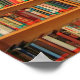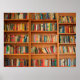 School library educational books on a brown wooden bookshelf for teachers, students and bookworms.