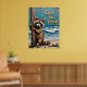 Ce charmant tableau présente un raton laveur en fourrure brune et blanche, accroché à un poteau en bois patiné sur une plage de sable. Les vagues de l'océan s'écrasent doucement dans l'arrière - plan sous un ciel brillant et partiellement nuageux. Le texte "Cute but feral" est écrit dans une police jaune stylisée au-dessus du raton laveur. L'oeuvre a des coups de pinceau épais et texturés, ce qui lui donne une sensation de fantaisie et un peu venteuse.