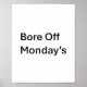 Ajoutez un peu d'humour à votre semaine avec notre affiche "Bore Off Monday's" ! Avec une citation audacieuse et sarcastique, ce design accrocheur est parfait pour égayer votre bureau ou votre maison et donner à lundi l'attitude qu'il mérite.