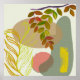 Design botanique avec des couleurs magenta, vert, jaune et marron et des éléments floraux.