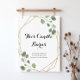 Ce panneau de bougie de calligraphie géométrique dorée est parfait pour un mariage rustique. Le design présente des branches et des feuilles de eucalyptus vert botanique dessinées à la main, ornant un cadre géométrique élégant.
