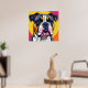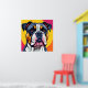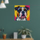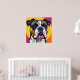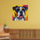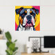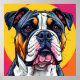 Illustration vibrante en gros plan du visage d'un bouledogue. Le chien a des yeux expressifs et une robe distinctive avec des couleurs noires, blanches et fauves audacieuses, sur un fond abstrait et lumineux composé de formes circulaires de teintes roses et jaunes.