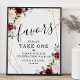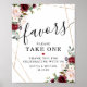 Fleurs avec bouquet de bourgogne et rose blush et forme géométrique dorée encadrant le script "favors" et la typographie classique "please take one" pour pancarte de mariage.