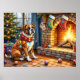 Affiche Boxer Sitting by Fireplace with Christmas Lights