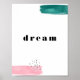 Une oeuvre d'art abstraite simple associée à la typographie, parfaite pour être encadrée pour n'importe quel espace dans votre maison. Ce design présente des coups de pinceau d'aquarelle en rose et turquoise et des éclaboussures en noir. Au centre se trouve le mot "rêve" dans la police noire moderne. Le mot central est modifiable.