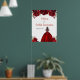 Ce signe de bienvenue de Quinceanera présente des fleurs à fleurs rouges en faux parties scintillant et une belle princesse aux cheveux bruns et une robe élégante. C'est parfait pour une fête d'anniversaire de Quinceanera.