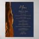 Le bord gauche de cet élégant panneau de menu mariage moderne comporte une bordure d'aquarelle orange brûlée et ornée d'une parties scintillant en faux or. Le mot "Menu" apparaît en écriture manuscrite de couleur or sur un arrière - plan bleu marine. Personnalisez le texte restant avec les noms du couple, la date du mariage et les détails du menu.