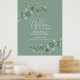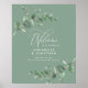 Belle délicate feuillage d'eucalyptus mariage accueil design signe de bienvenue. Moderne élégant sur tendance sauge vert, noir, bleu marine et blanc élégant collection contemporaine rustique. Idéal pour les mariages de printemps, d'été, d'automne ou d'hiver.