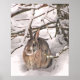 Cette affiche photographique d'art met en scène une scène hivernale typique : un lapin de lapin à gros seins brun et doux aux oreilles est enserré sous un pin à la recherche d'un abri de la tempête de neige.