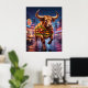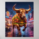 Œuvre d'art massive représentant un taureau puissant fait de pains empilés, de textures de bœuf grillé, de couches de fromage fondu, de feuilles de laitue, d'accents de tomates et de reflets de sésame. Chargeant à travers un quartier ranch néon avec des diners rétro, des enseignes chromées, des voitures classiques, des grils grésillants, du pavé mouillé et de la lumière de la ville, ce design d'animal de fantaisie énergique se sent audacieux et moderne. Parfait pour les salles de jeux, les cuisines, les diners, les cavernes d'hommes, les restaurants ou la décoration d'intérieur.