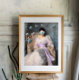Peinture remixée vintage d'une femme portant une robe blanche vintage avec des papillons pastel bleu.