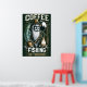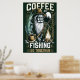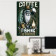 Illustration numérique d'un homme avec une longue barbe, portant un casquette, tenant une canne à pêche et une tasse de café. L'illustration est placée contre un arrière - plan forestier avec un feu de camp et une lune dans le ciel. Le texte Café et Pêcher ensemble est écrit au bas de l'image.