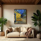 Cette peinture d'une vue extérieure colorée est une oeuvre pittoresque, la vision d'un spectateur détendu qui aime le charme de son environnement sans aucune inquiétude. Il rappelle l'humeur de Van Gogh lorsqu'il écrivait que "la nuit est plus vivante et plus colorée que le jour." Le jaune du café joue contre le bleu-noir de la rue éloignée et le bleu-violet de la porte d'entrée, et, par un paradoxe de composition qui aide à unifier l'oeuvre, au point le plus fort du contraste, le coin de l'auvent le plus proche de nous touche le ciel bleu éloigné. L'aspect le plus accrocheur du tableau est le contraste saisissant entre les couleurs chaudes jaune, vert et orange sous la marquise et le bleu profond du ciel étoilé, renforcé par le bleu foncé des maisons de l'arrière - plan. Customisez-le avec vos propres détails. Pour une personnalisation plus poussée, veuillez cliquer sur le lien "Personnaliser" et en utilisant les outils de conception avancée de Zazzle, vous pouvez personnaliser chaque pièce pour faire un cadeau unique pour toute occasion