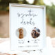 Ce panneau de boisson signature est doté de deux emplacements photo, d'une police manuscrite pointue, d'un design minimaliste moderne et d'une combinaison bleu marine et blanc. Modifiez facilement la police et la couleur arrière - plan pour correspondre à votre événement. Ce panneau est parfait pour ajouter une photo de la mariée et du marié, des enfants, ou vos animaux de compagnie préférés.