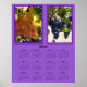 Des raisins mauves pendent au milieu de feuilles écorchés verts et oranges sur la droite. Sur la gauche se trouve une image rapprochée d'une seule feuille orange et jaune sur la vigne. Calendrier de 12 mois en bas. Les images sont encadrées avec du violet foncé. L'Arrière - plan est un violet plus clair.