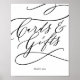 Cette calligraphie romantique fleurit cartes et signes cadeaux est parfait pour une simple douche mariage ou nuptiale. Le design classique moderne comprend des tourbillons fantaisistes et des fleurs fantaisistes avec une magnifique typographie élégante et lettrée à la main. La ligne de texte en bas du panneau peut être personnalisée avec la date, les noms de la mariée et du marié, ou un message court comme "Merci". Ce signe peut être utilisé pour un mariage, un événement ou une fête.
